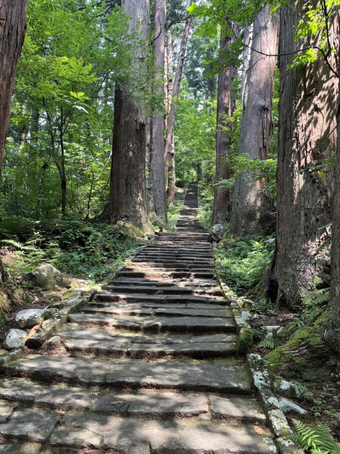 羽黒山では、2,446段もあるという石段を登って出羽三山(月山・羽黒山・湯殿山)の三神を合祭した三神合祭殿へ参拝してきました。石段はかなりの急斜面で何度も休憩しながら登りきり、巨大な茅葺屋根の拝殿には圧倒されました。