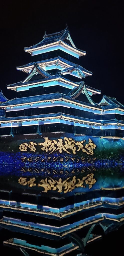 現存12天守(江戸時代以前に建設された天守が、災害や廃城令を免れて現在まで残っている)の一つである「松本城」は日中見ても素晴らしいのですがライトアップは殊更に迫力がありました。