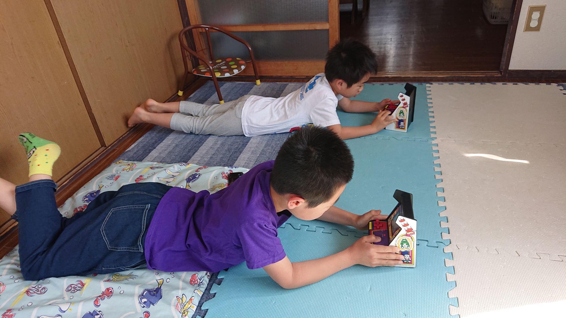 少しお行儀が悪いですがお店で安いゲームを買ってもらったみたいで、兄弟仲良く同じ体勢で楽しんでいました。