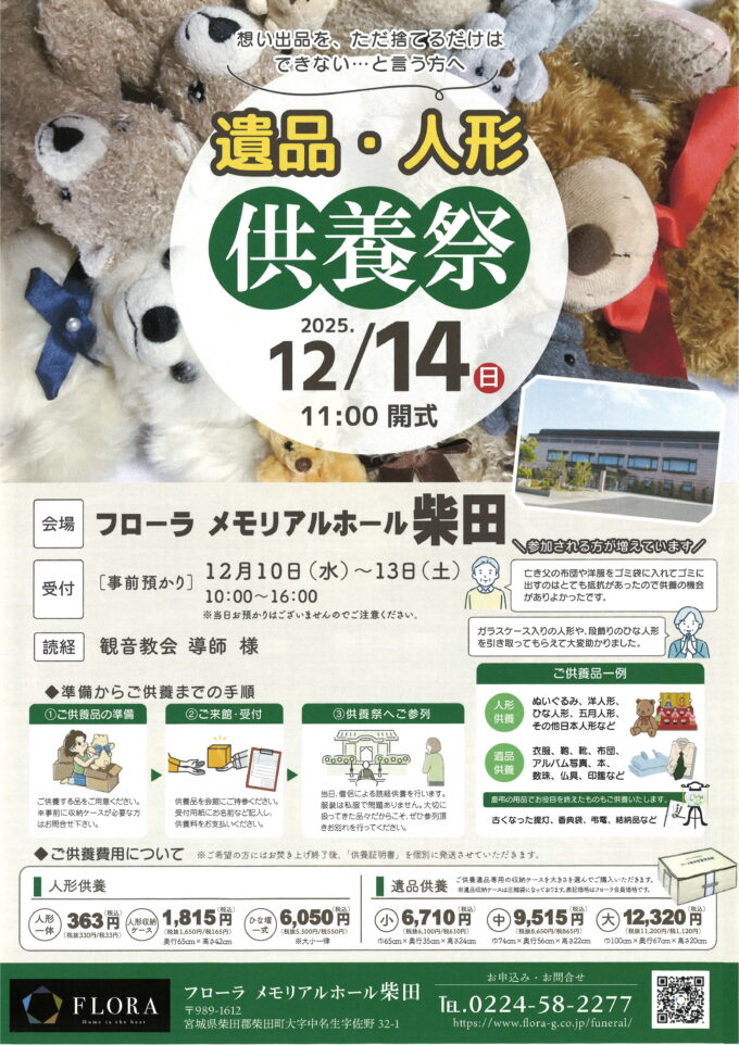 さて、今年の最後にメモリアルホール柴田にて遺品・人形供養祭を行います。