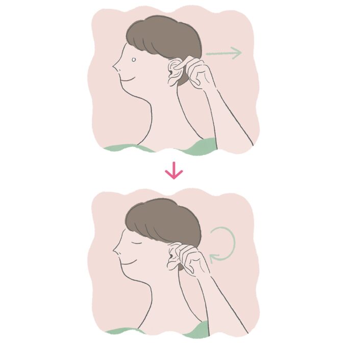 ④耳まわし ➡ 親指と人差し指で耳をつかみ、外側にひっぱる。数秒間キープしたら、上から下へ向かってぐるりと回す。