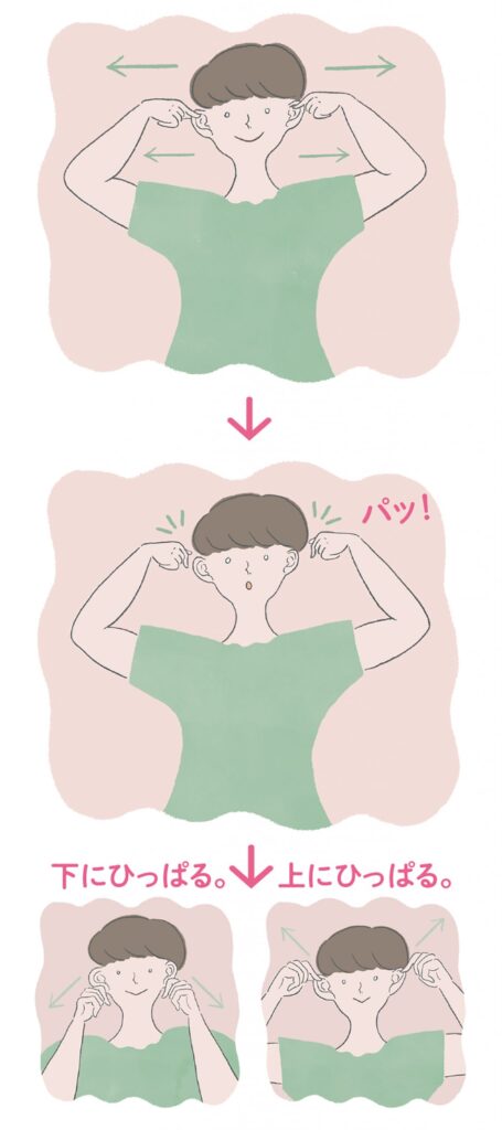 ③耳ひっぱり ➡ 親指と人差し指で耳をつかみ、両外側にひっぱる。数秒間キープし、勢いよくパッと手を離す。