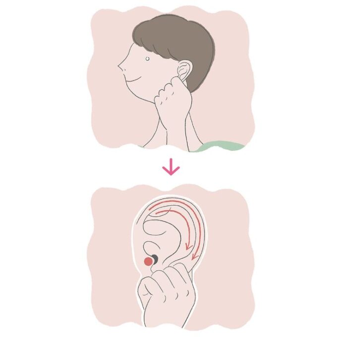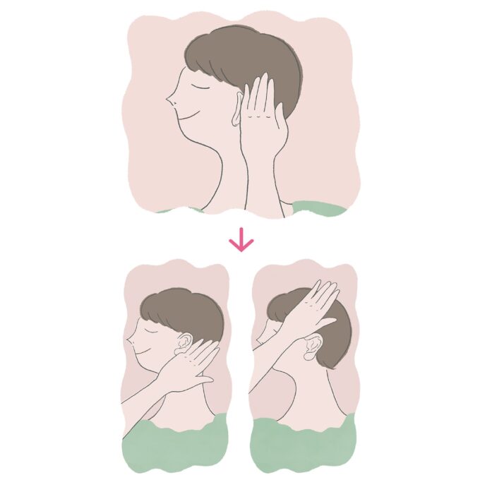 最後に手の小指側を使い、耳を下から上に押さえて折る。それぞれ3~5秒程。左右で行う。