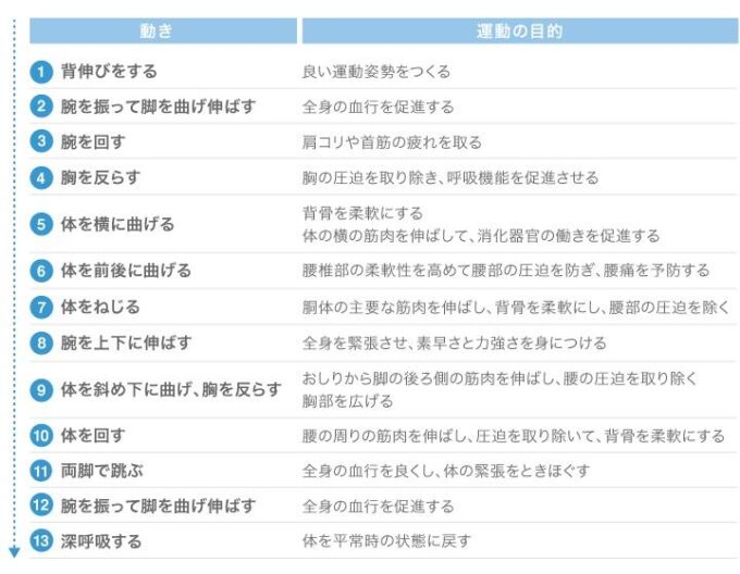 「ラジオ体操」第一は約3分で13の動きをしていきます。