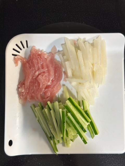 ボウルに千切りにした生ハム・梨・きゅうりを入れAを加えて全体をよく和える。