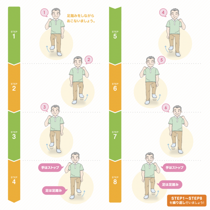 1人で出来る3回目は、足踏みをしながら、手で肩をタッチする運動になります。