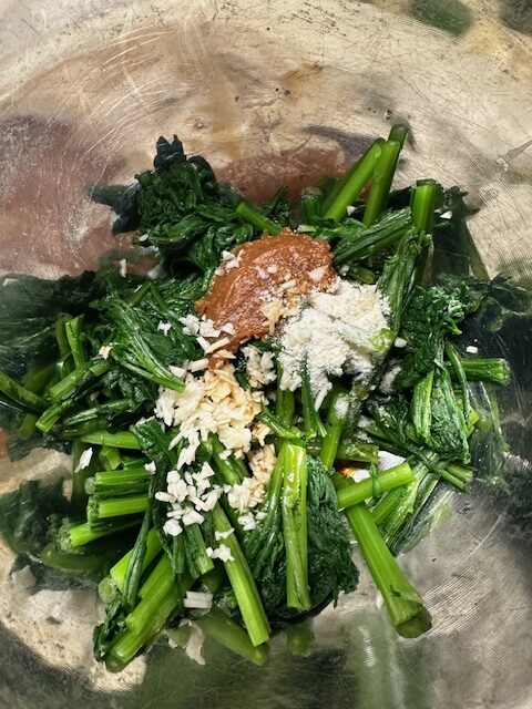①春菊は塩少々を入れたたっぷりのお湯でさっとゆでる。(茎の太いものは少し長めにゆでる)ざるにあげて冷水にさらして水気を絞る。