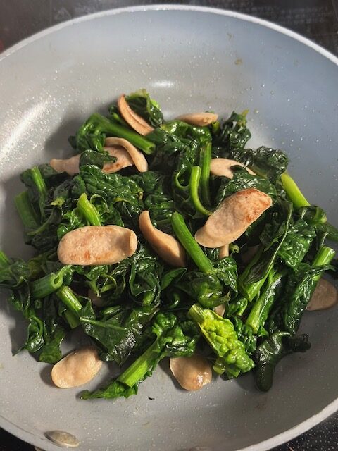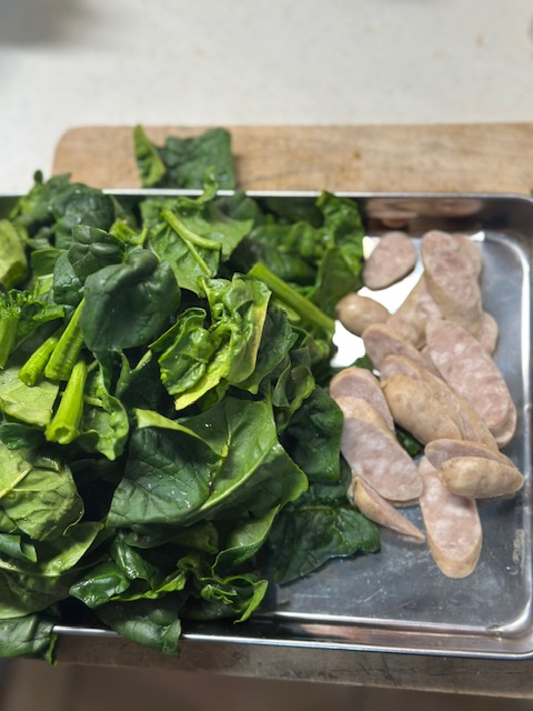 ③熱したフライパンにオリーブオイルを入れ、ちぢみほうれん草とベーコンまたはソーセージを炒める。