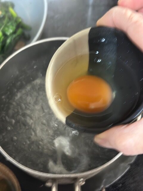 ④小鍋にお湯を沸かし、沸騰したら酢を入れ、卵を入れてポーチドエッグを作る。
